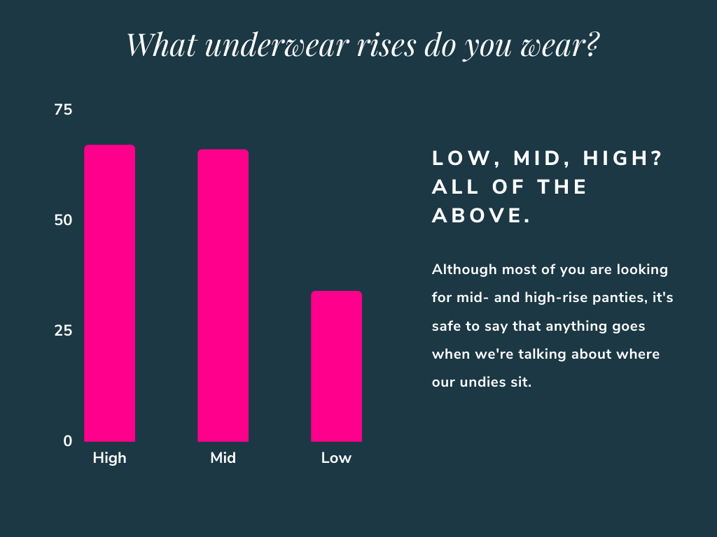 As far as underwear rise, most of those surveyed preferred underwear that sits just below the belly button (known as mid-rise) or underwear that sits higher at the belly button or the location of the natural waist (considered high-rise). Low-rise styles sit below the belly button and on the hips.