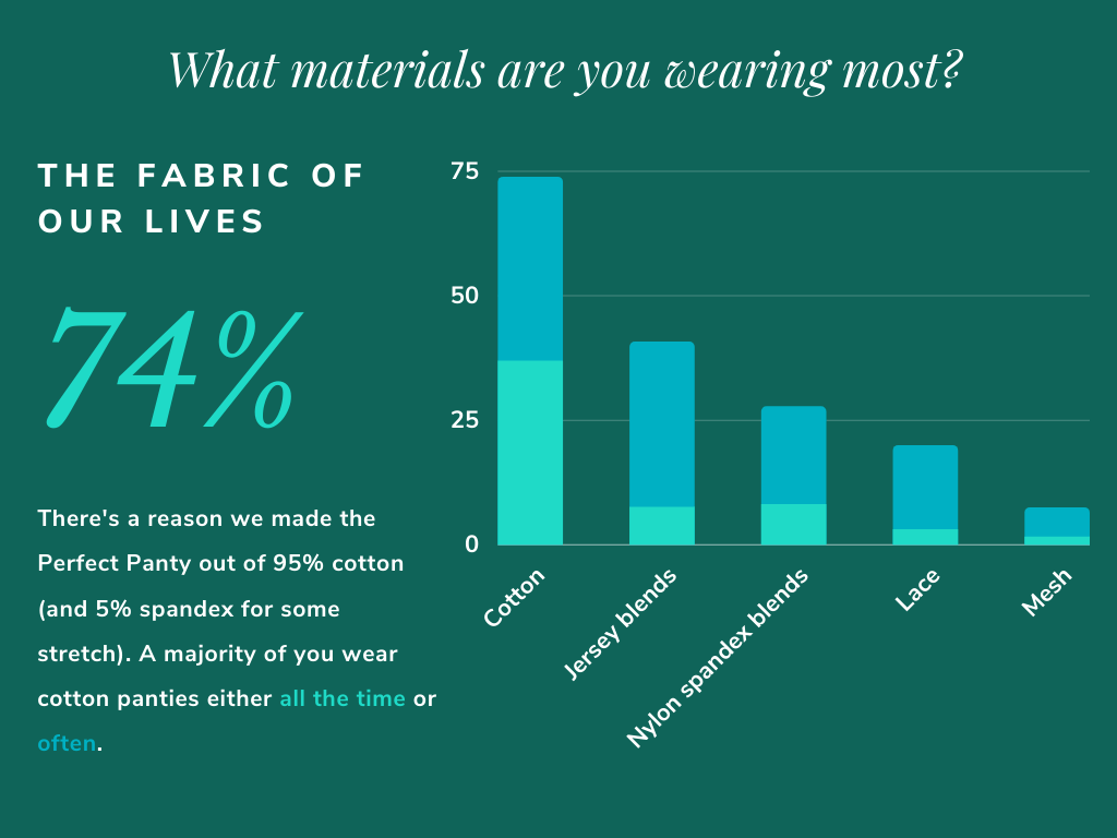 Finally, it’s probably not a surprise but cotton is the most popular fabric for panties by a lot! About 75% of you are wearing it either “All of the time” or “Often”. It’s no wonder that we decided to make the Perfect Panty out of 95% cotton (and 5% spandex for stretch).